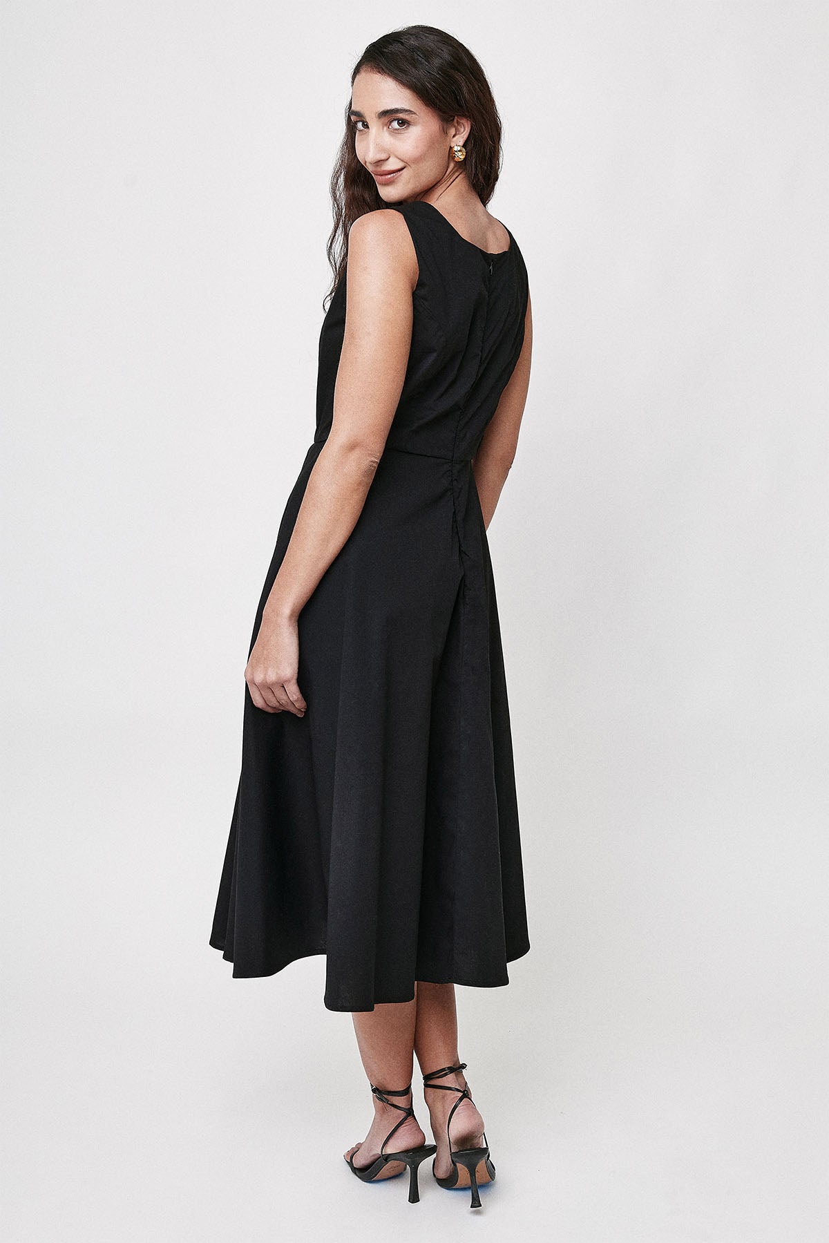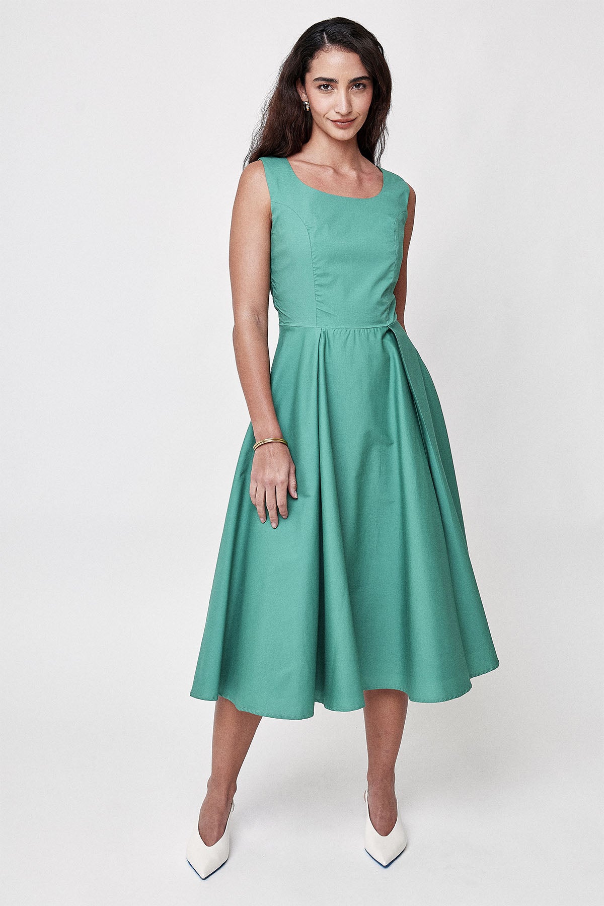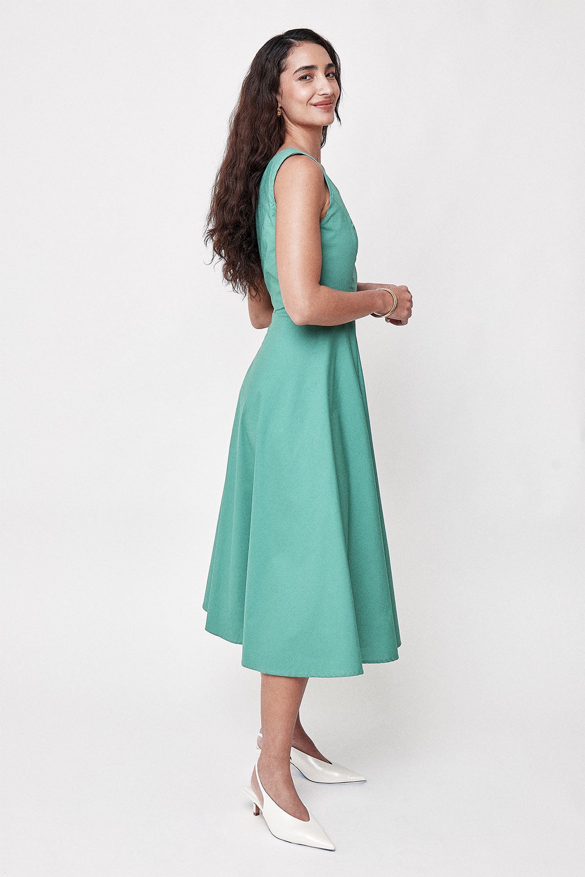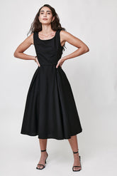 This dress features a delicate scoop neck and a fitted bodice, transitioning seamlessly into a chic A-line skirt.